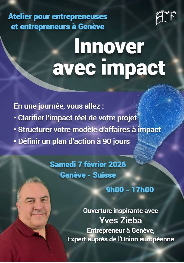 Et si votre entreprise n’était pas seulement rentable… mais aussi nécessaire pour la société ? Cette journée réunit des entrepreneurs.euses engagés.ées, un expert de l’innovation à Genève, Yves Zieba, et une équipe de coachs pour passer de l’inspiration à l’action concrète. En une journée, vous clarifiez l’impact de votre projet, revisitez votre modèle d’affaires et repartez avec un plan d’action à 90 jours.
